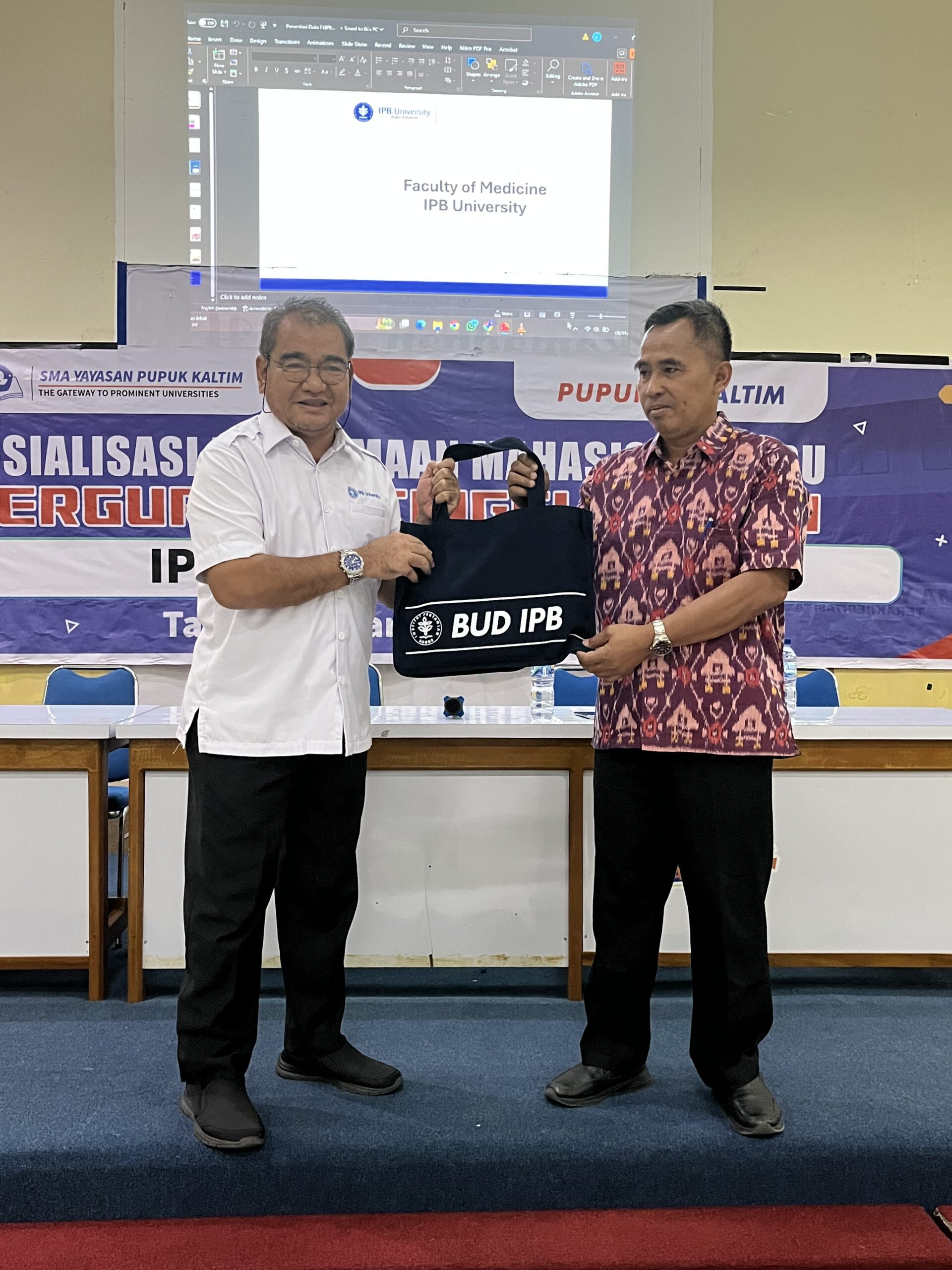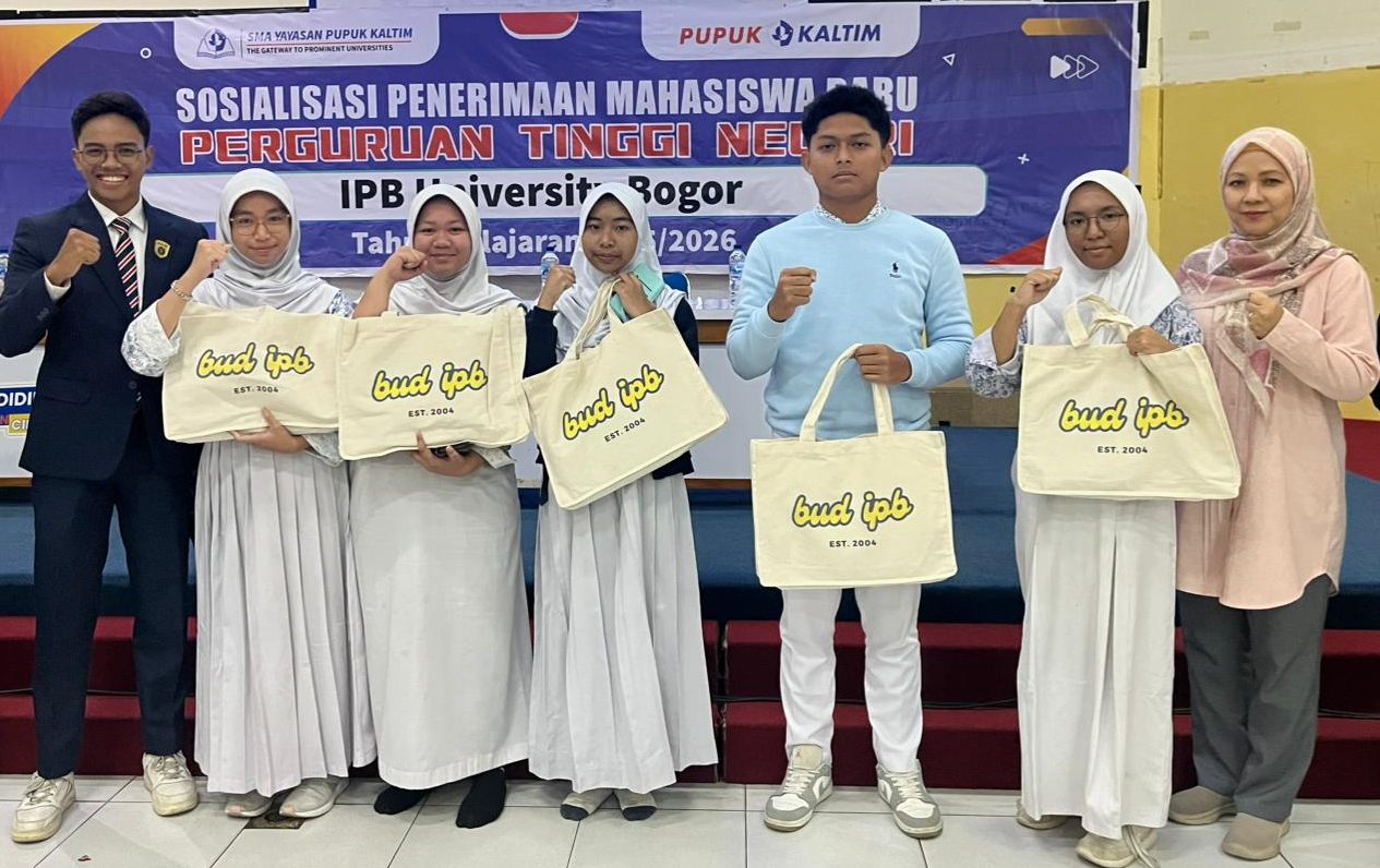 Bontang, 9 Januari 2026 – IPB University kembali mengunjungi Yayasan Pupuk Kaltim di Bontang, Kalimantan Timur. IPB memenuhi permintaan Yayasan Pupuk Kaltim sebagai mitra BUD untuk mensosialisasikan program studi dan jalur masuk IPB. Sosialisasi dilaksanakan di aula SD Yayasan Pupuk Kaltim 1 dengan diikuti oleh 221 siswa-siswi SMA Yayasan Pupuk Kaltim beserta wali murid.