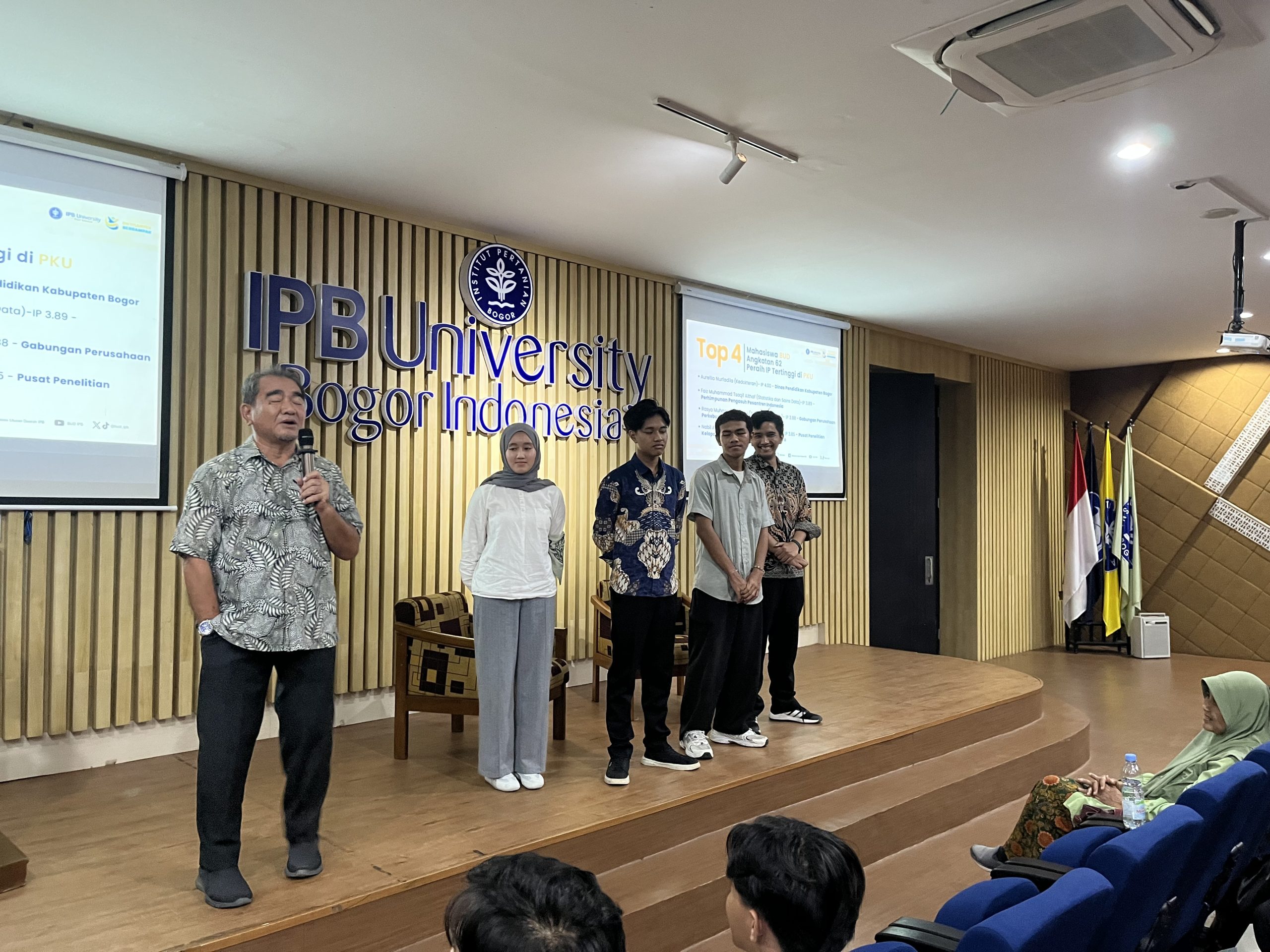 Kegiatan ini juga dihadiri oleh Ketua Tim BUD IPB University, Dr. Ir. Ibnul Qayim. Dalam sambutannya, beliau memberikan apresiasi kepada empat mahasiswa dengan perolehan Indeks Prestasi (IP) tertinggi. Mahasiswa yang menerima penghargaan tersebut adalah